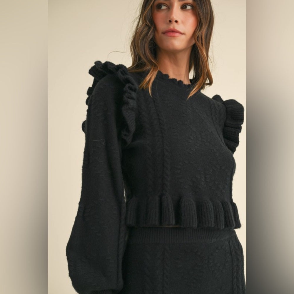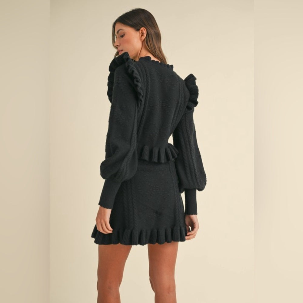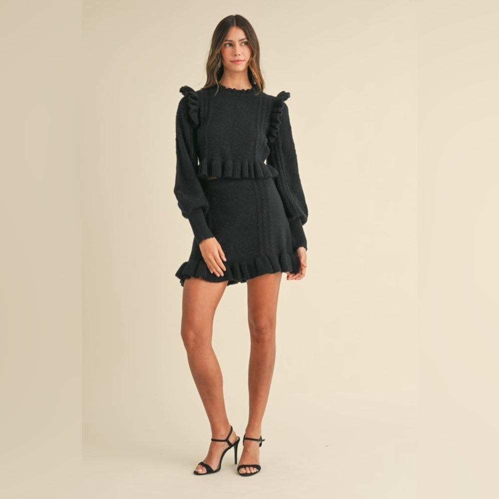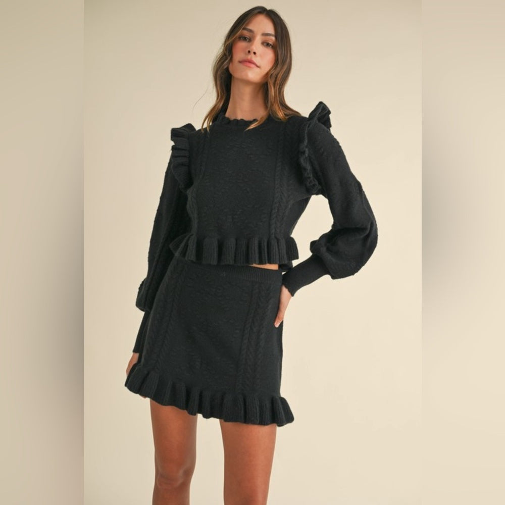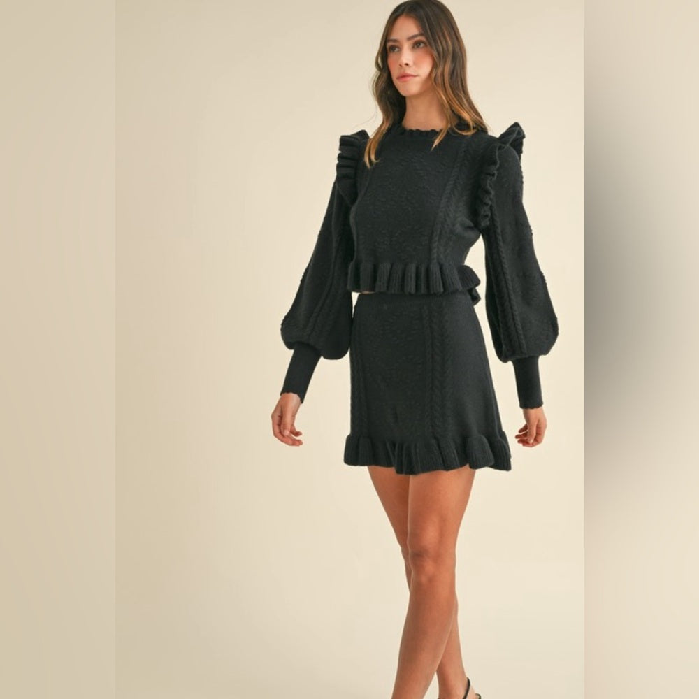 Ruffle knit two piece set with long sleeve ruffle peplum crop top and mini skirt. Soft and thick fabric. Not see through. High quality and sooo cute!