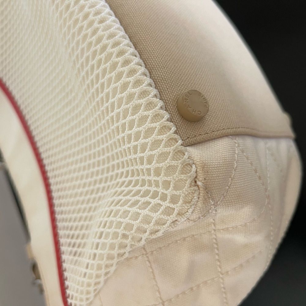 Adorable sporty Chanel!!! Good to very good condition. The biggest call out is some staining inside. There is no stickiness or odor. I have not tried cleaning it yet. I recommend using a felt insert anyway. I took pics of all the flaws I could find. Hardware with minimal scratches. Overall this bag is darn cute! Zippers work well. Comes with original authenticity card as shown.