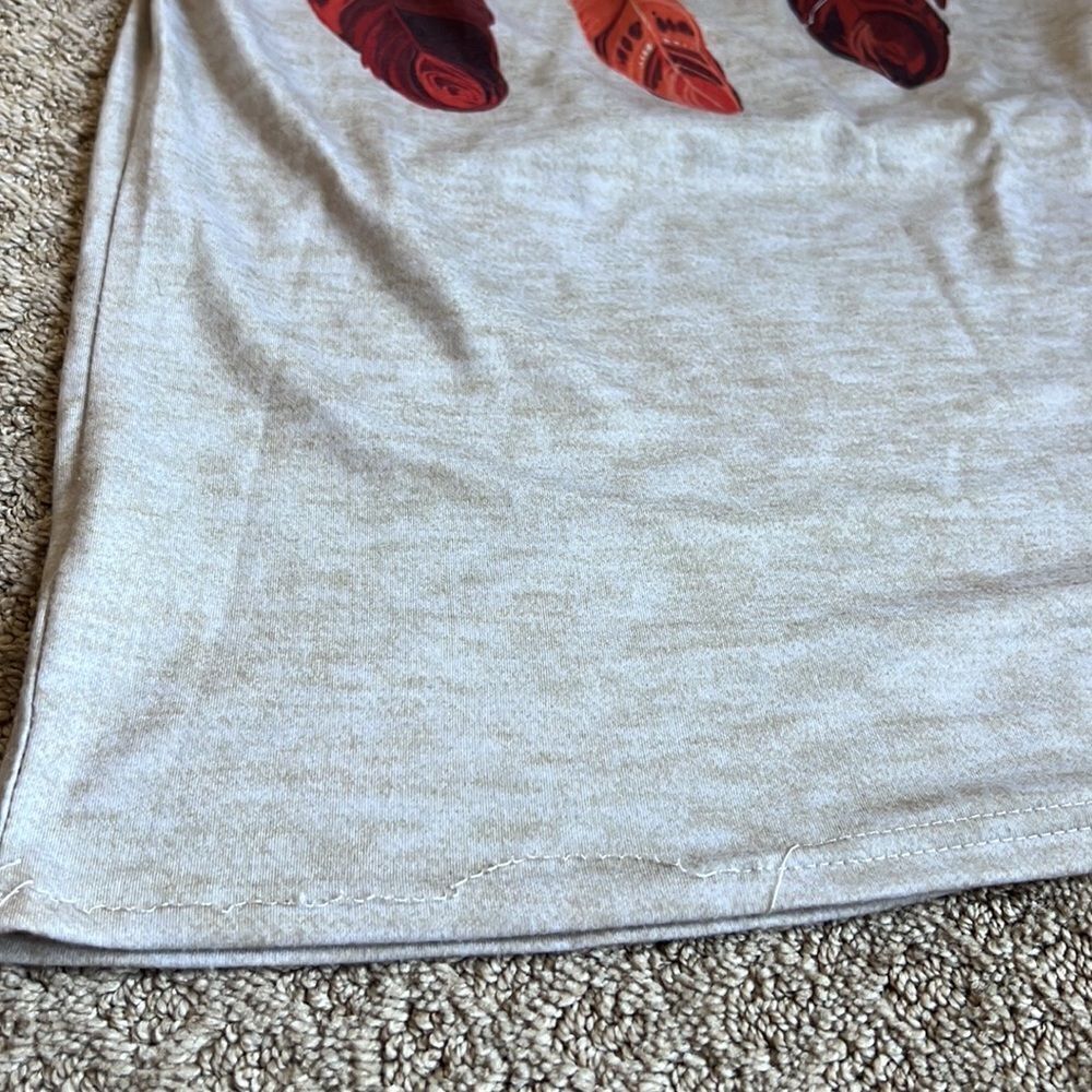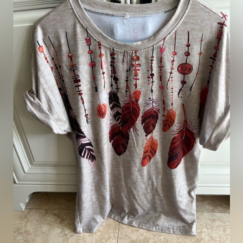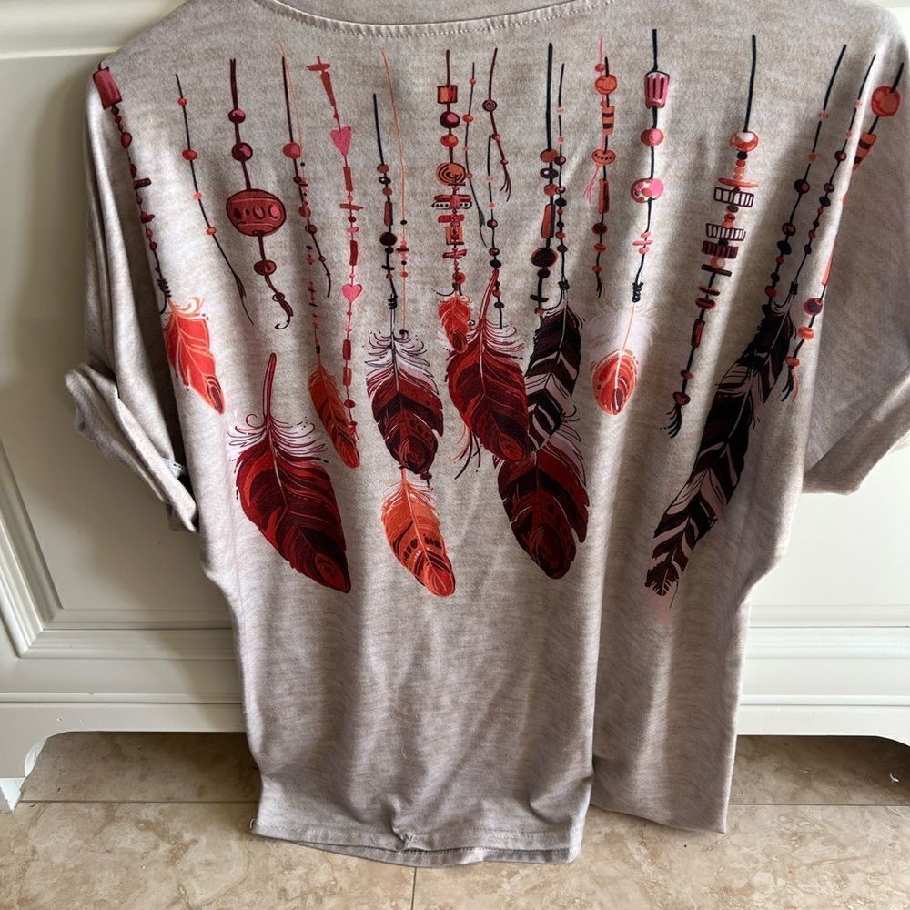 Super cute BoHo T-shirt with feathers. Only worn once. When I was measuring this, I noticed the helm threading was loose on the back bottom part of the shirt. Happy to accept a lower offer because of this. From a pet and smoke free home.