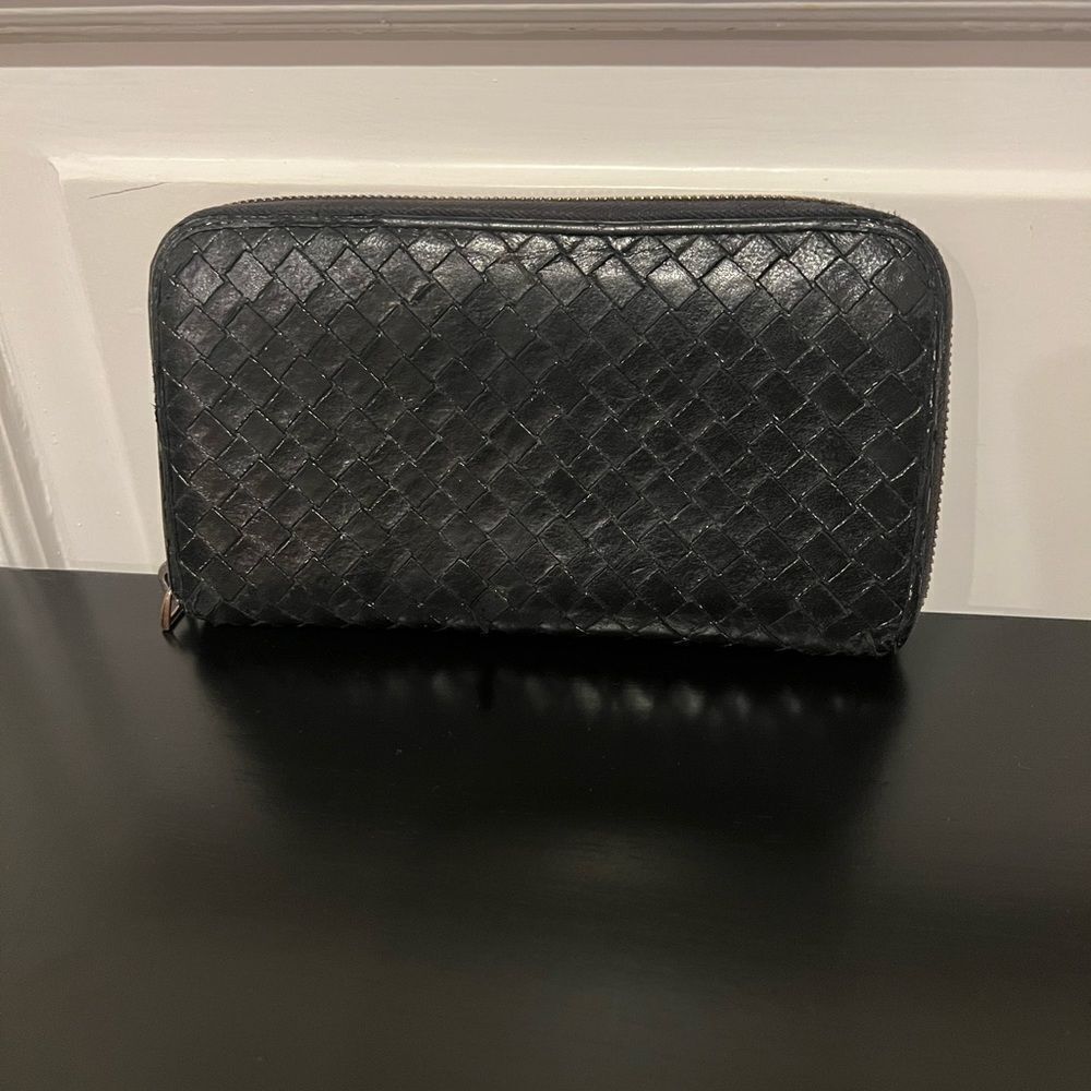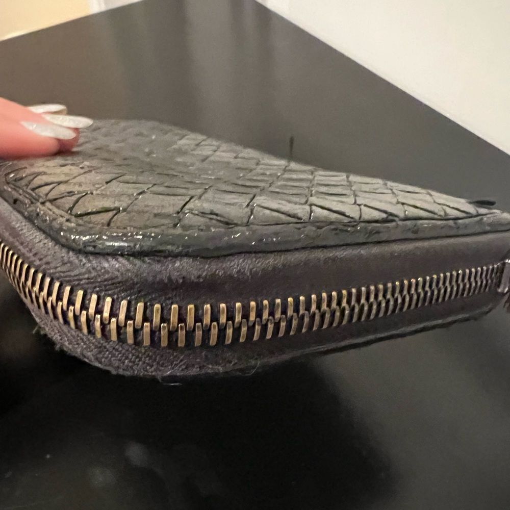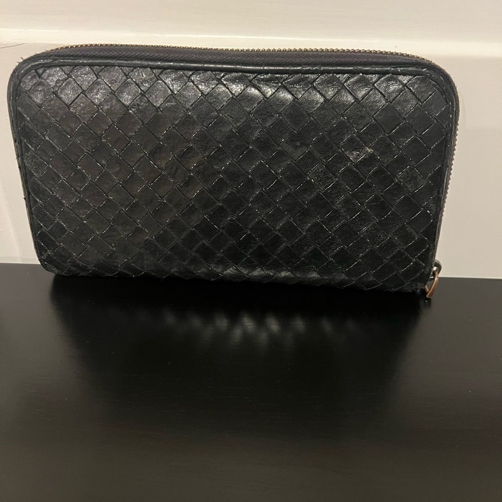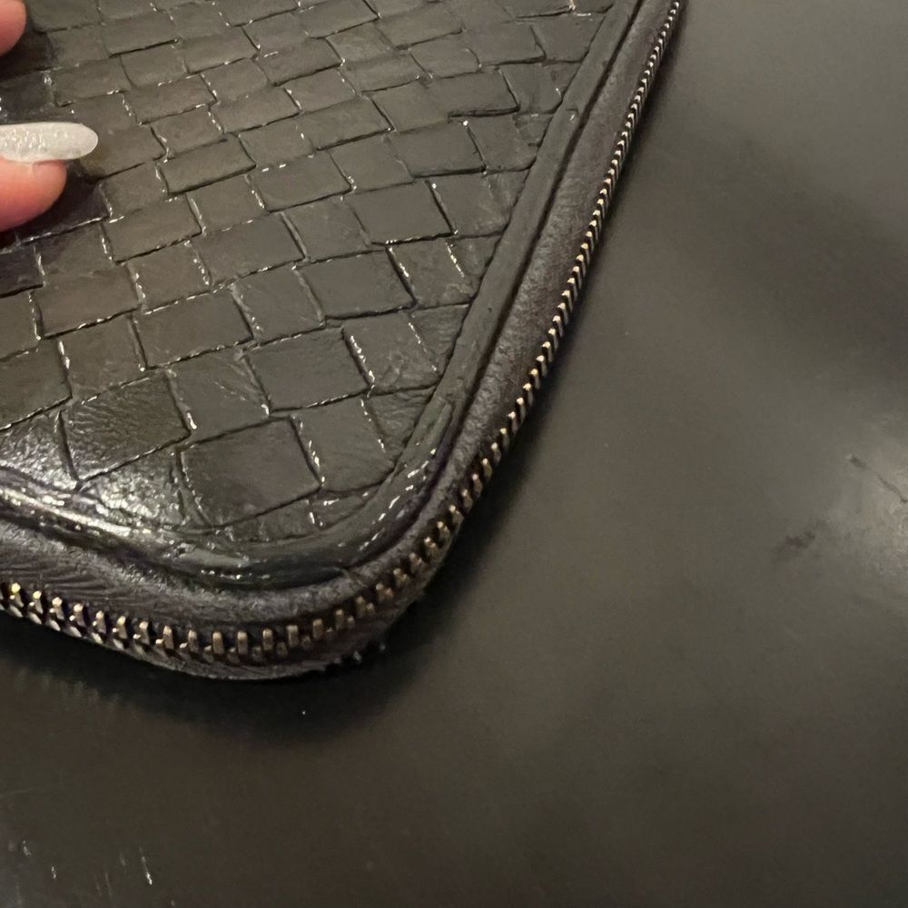 Black BOTTEGA VENETA zippy wallet in fair condition. Missing both zipper pulls. Zipper work well. One small leather square needs to be glued back down. That’s why I’m listing at a great deal! All easy fixes! Pet and smoke free environment.