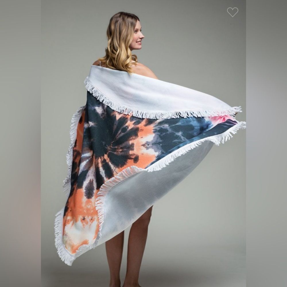 Round Tie-Dye towel with fringe. New boutique item. 58” diameter