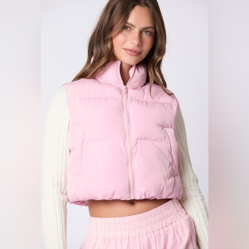 This adorable pink puffer vest with satin bow is so feminine and elegant yet sporty and fun. The quality is amazing and feels like down feather inside. It is fully lined. It has pockets on both sides.