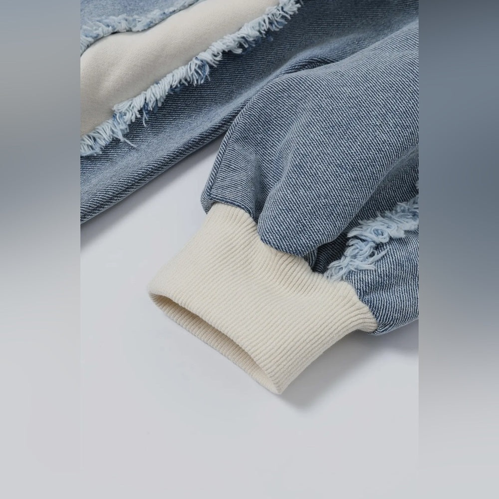 Stylish denim patchwork hoodie with a unique design. Features a blend of blue denim and cream color for a hybrid denim hoodie mashup.