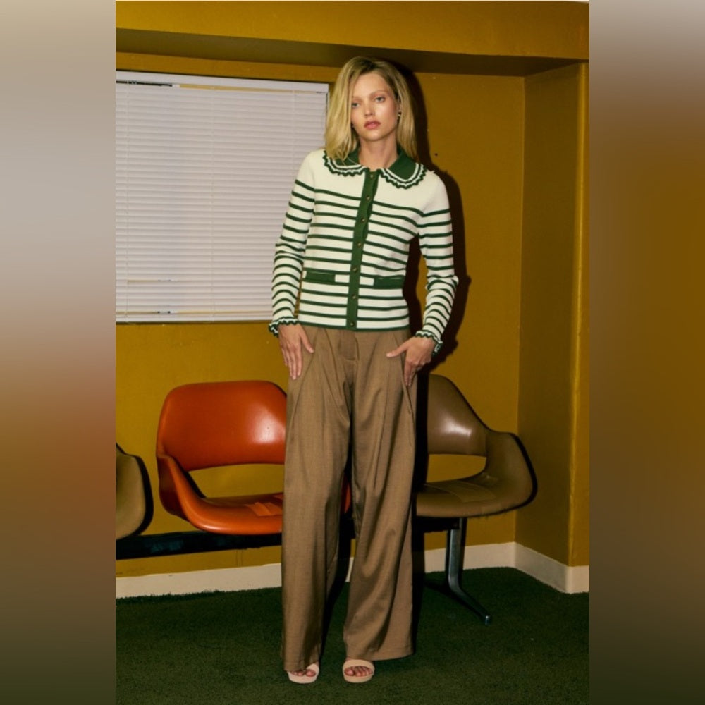 This cardigan is cappucino and cream (not green like the photos)!! Amazing 1960’s vibes with large collar and stripes. Super soft great quality. Pants are also for sale, see listing 567.