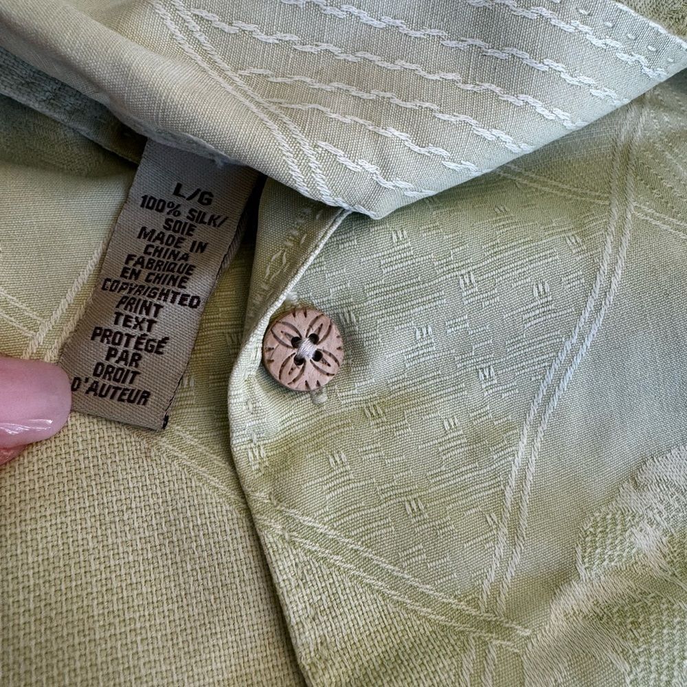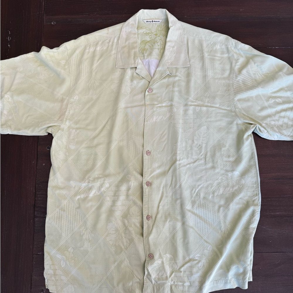 Stylish light green Hawaiian shirt by Tommy Bahama. Features a subtle leaf pattern. Perfect for casual wear.