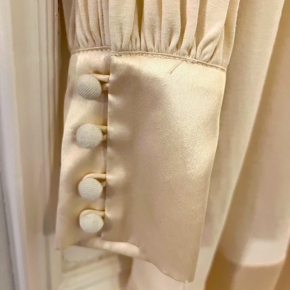 Never worn! Beautiful beige/cream colored dress with satin. Buttons on the cuffs. No flaws. Pet and smoke free home.